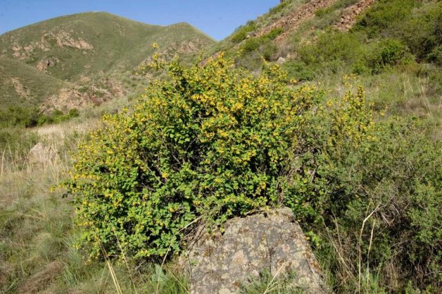 En alçada pot arribar a un màxim de 3,5 m, no hi ha tants arbusts, la corona s'estén amb un gran nombre d'espines. Els brots són grocs, amb el pas del temps canvia a un to gris-groc. El color de les fulles canvia segons la temporada: a l’estiu - verd ric, a la tardor - vermell brillant. Els fruits creixen de color vermell amb una pell brillant, apta per al consum humà. La verema comença al novembre.