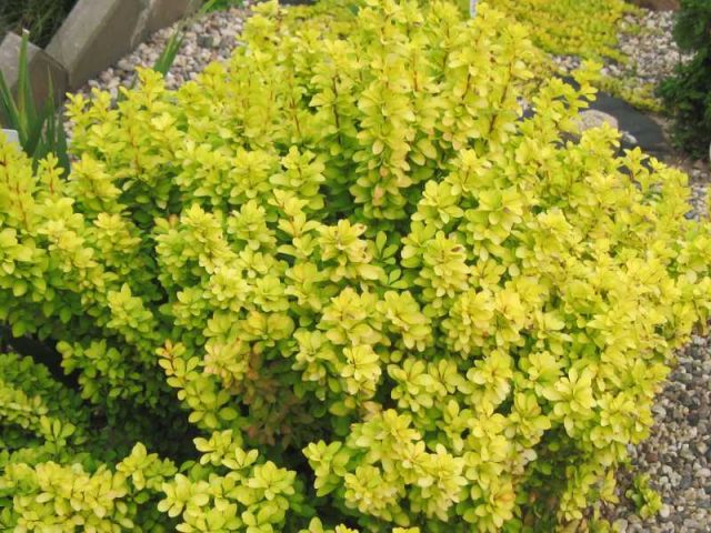 L'arbust espinós ornamental Thunberg Aurea barberry en la seva descripció té la principal diferència respecte a altres barberes Thunberg de color - groc llimona.