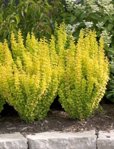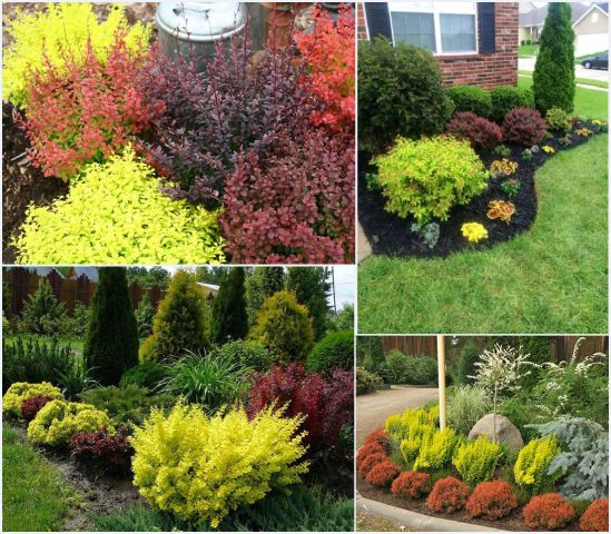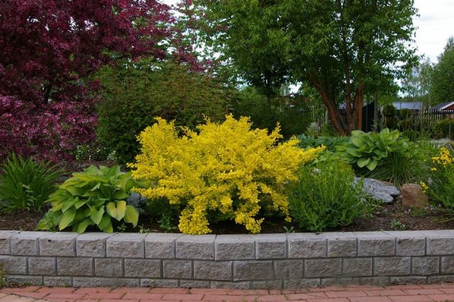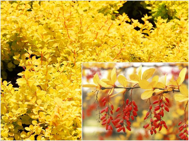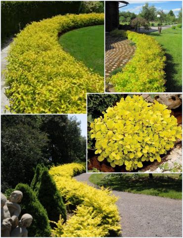 Les taques brillants amb el seu color variat creen arbustos de la mora de Thunberg Aurea de diferents varietats, si els planteu al mateix lloc un per un o en grups, com es pot veure a la foto.
