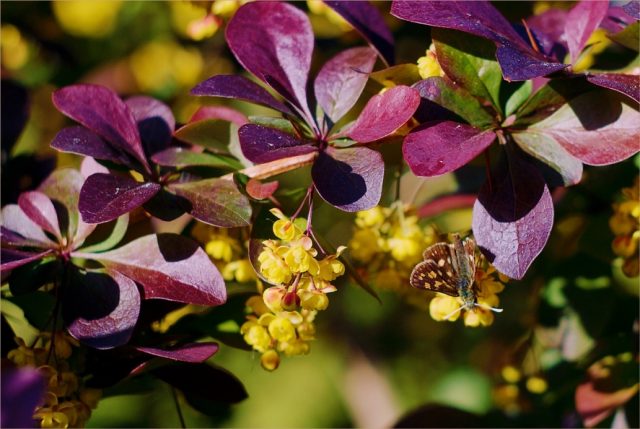 La superfície de les petites i boniques fulles de color porpra fosc està coberta amb un exquisit patró de taques roses i platejades. El Thunberg Flamingo Barberry floreix al maig. Les flors són força discreta. Són de mida petita, de color groc, recollides en inflorescències. El període de floració abundant dura 1-2 setmanes.