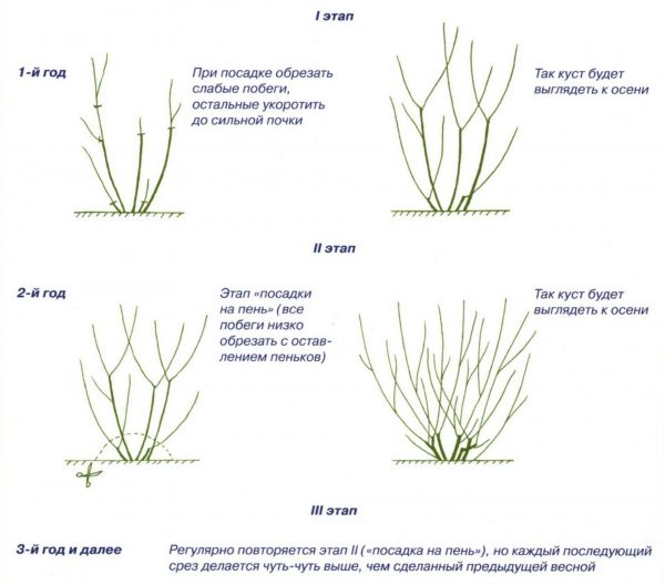 La poda rejovenidora d’arbusts vells (10-12 anys) està prevista per a la tardor. Els jardiners novells formen un arbust en 3 etapes, s’adhereixen a l’esquema més senzill del seu treball.