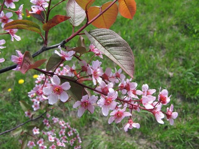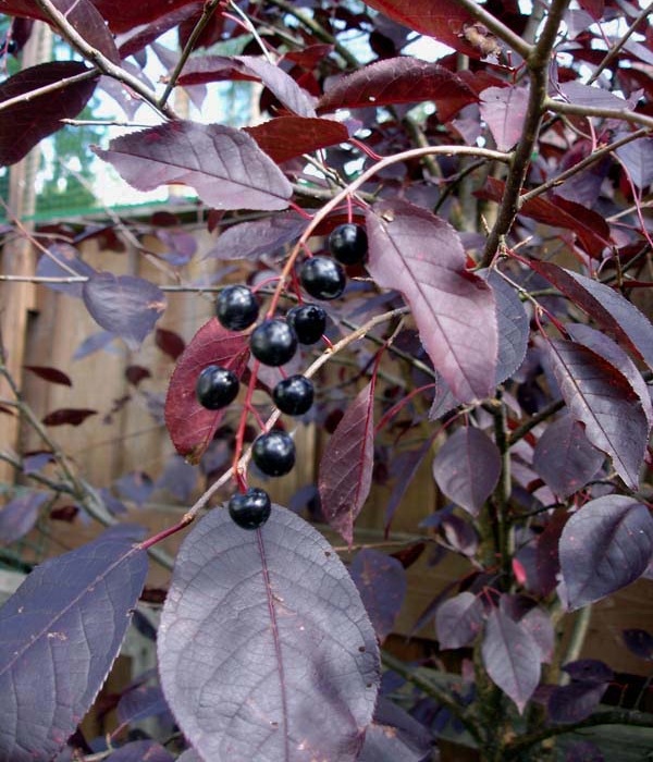 Colorata. Un petit arbre i arbust de fins a 6 m d’alçada. Les plantes joves tenen fulles de color porpra i els adults tenen fulles verdes amb venes de color porpra. Les flors són molt vistoses, rosades, creixen en raïms caiguts. Els fruits de la cirera són negres, aptes per al consum humà.