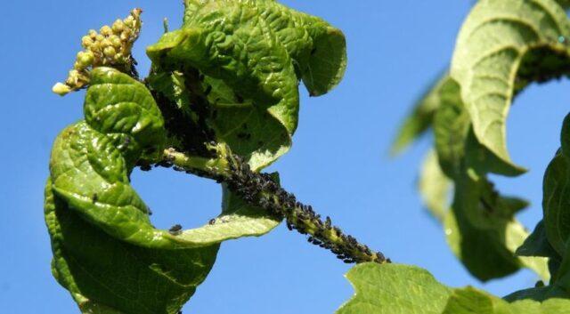 Els pugons negres disposen urpes a l'escorça de Buldenezh i comencen a danyar els arbustos amb l'arribada de la primavera