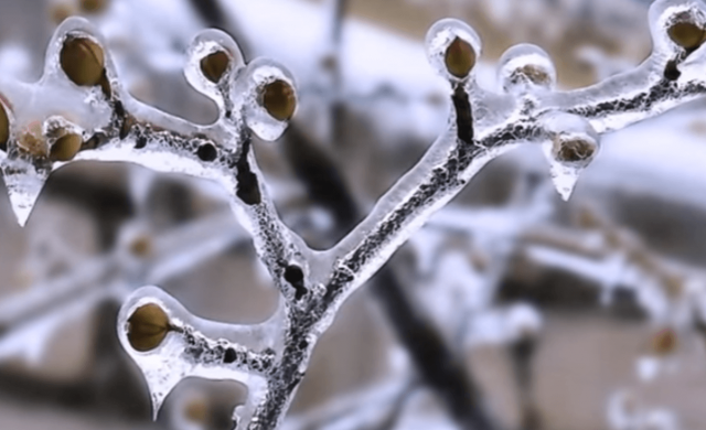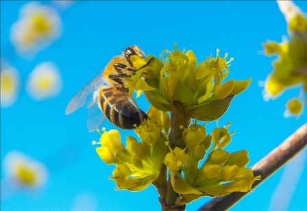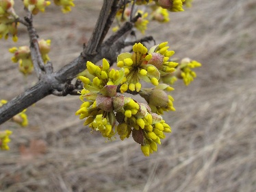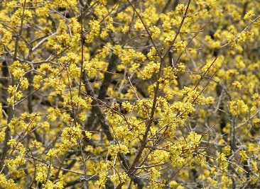 Foto de com floreix el corni comú durant les gelades amb la cobertura de les branques.