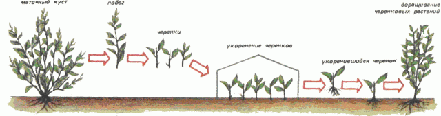 A la tardor, els esqueixos es cullen dels brots lignificats de la gespa mascle, que es guarden a la nevera fins a la primavera. A la primavera, es planten en un lloc permanent, prèviament s’han remullat en un estimulador del sistema radicular.