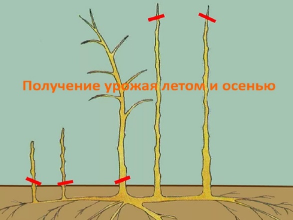 Segons el segon mètode, la collita només es cull dels brots del primer any i al final de la temporada es tallen completament. Al sud, es fa a la tardor, a les regions del nord, a la primavera, per tal de facilitar la retenció de neu al lloc.