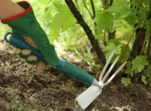 L’afluixament al voltant de la base de l’arbust es duu a terme a una profunditat d’aproximadament 5 cm sota la corona, aprofundint 15 cm, i en els passadissos caven fins a una profunditat de 20-30 cm. Després d’afluixar-se, el sòl i l’arbust es tracten amb Karbofos segons les instruccions o amb àcid bòric.