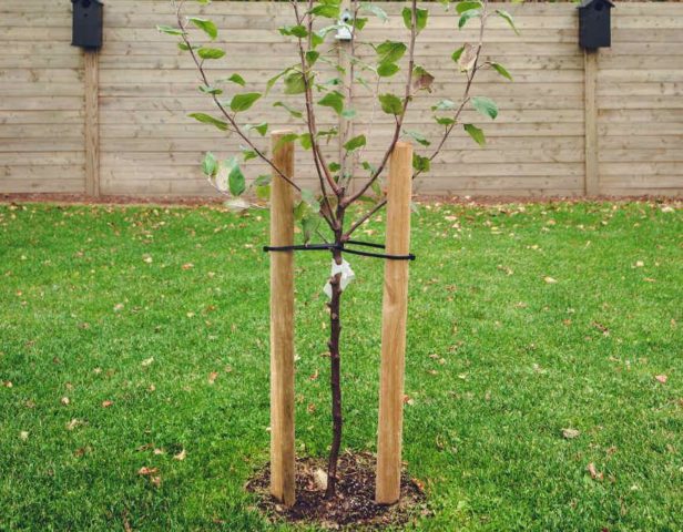 Fins que la cirera no s’enforteixi, val la pena organitzar un suport. Conduïu-lo amb cura, sense danyar les arrels. Inclineu l’estaca en la direcció del vent i lligueu-hi el tronc.