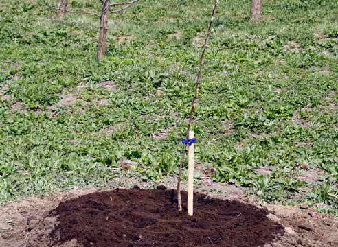 La terra de Sod es barreja amb humus en una proporció de 1: 1, les arrels de la plàntula estan cobertes amb ella. El sòl que l’envolta ha de ser lleugerament apisonat de manera que es formi un solc anular de 8-10 cm de profunditat al voltant de la plàntula. Després, la plàntula es rega amb tres cubells d’aigua i el terreny que l’envolta es mulch amb serradures o humus.