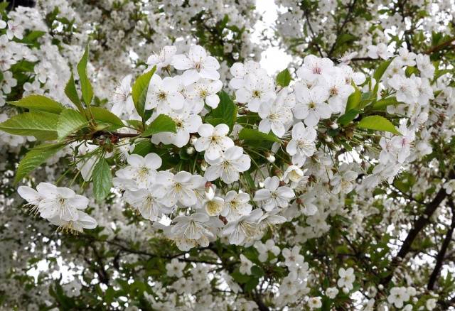 El cirerer d'aquesta varietat és parcialment autofecund; en absència de pol·linitzadors, el 20-50% dels ovaris de les flors es fertilitzen. Per augmentar els rendiments, es recomana plantar qualsevol cultiu de fruita d'os amb períodes de floració similars a prop d'Ashinskaya. Floreix a l'última dècada de maig, període de floració prolongat. Foto de cirerer Ashinskaya durant el període de floració següent.