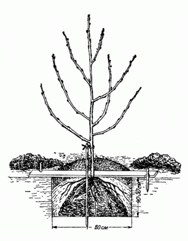 - Aboqueu-la al voltant de la plàntula (com a mínim 8-10 L) i lligueu la cirera a una clavilla.