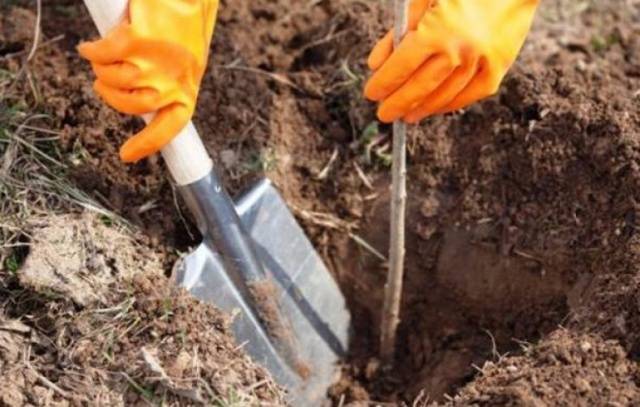 - La plàntula es col·loca al centre del pou i es cobreix amb una barreja de terra, fertilitzants i humus. El sòl està constantment copejat amb cura amb un mànec de pala. El coll d'arrel ha de sobresortir de 5-7 cm del nivell del sòl.