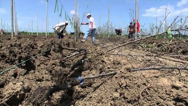 - Col·loqueu una plàntula al mig, empleneu l'arrel, compactant constantment el sòl perquè no es formin buits. La distància del coll a la superfície del terra ha de ser de 5-7 cm.