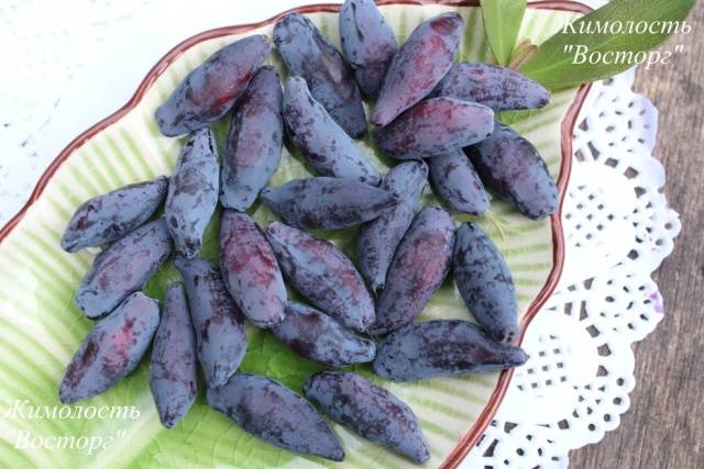 Els fruits són de color porpra intens amb una floració cerosa gruixuda. La massa de les baies fusiformes és d’uns 2,6 grams. Els tastadors valoren la palatabilitat en 4,8 punts. Les baies comestibles de la varietat de lligabosc Vostorg contenen fins a un 8,9% de sucre, de manera que tenen un sabor agredolç, sense amargor. Els fruits recorden una mica els nabius i els nabius, fragants amb un agradable regust.
