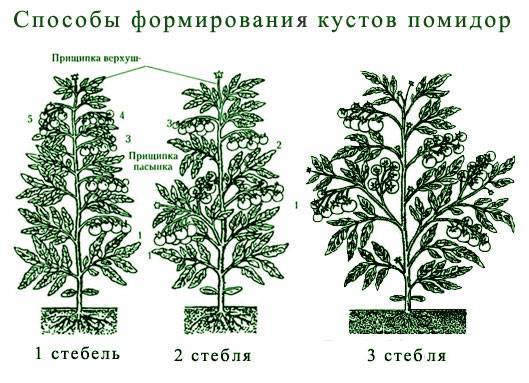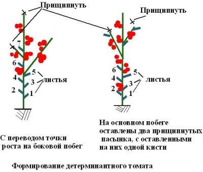 Tot i això, la majoria de les varietats determinants necessiten donar-se forma. Hi ha dues maneres principals de créixer els determinants: en 1 i en 2 tiges... En el primer mètode, es deixa una tija principal al tomàquet, eliminant tots els fillastres. En el segon mètode, el cultiu es formarà al brot central i en un fillastre, hauria de situar-se directament sota el raspall inferior de la flor.