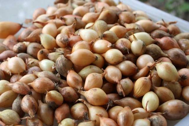 Per créixer per cap, heu de triar un conjunt de mida mitjana, el diàmetre de les bombetes ha d’ésser d’1 a 2 cm. Les bombetes més grans i fortes, adequades per a l’emmagatzematge a llarg termini, creixeran a partir d’aquest material.