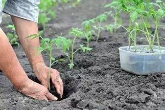 Caven forats al llit del jardí per obtenir plàntules. La distància entre ells depèn de les varietats. Per als tomàquets de baix creixement, n’hi ha prou amb mantenir un pas de 40 cm i, per als tomàquets alts, la distància s’incrementa fins a 50 cm. Al mateix temps, s’adhereix un espaiat de fila de 70 cm. La profunditat del forat es selecciona segons el volum del got amb la planta. Normalment, 30 cm són suficients. El tomàquet es retira amb cura del got juntament amb un terreny, es baixa al forat i, a continuació, s’escampa amb terra. Si la plàntula cau, podeu posar-hi una claveta i lligar-hi la planta. Després de plantar el tomàquet, es rega el forat amb aigua tèbia.
