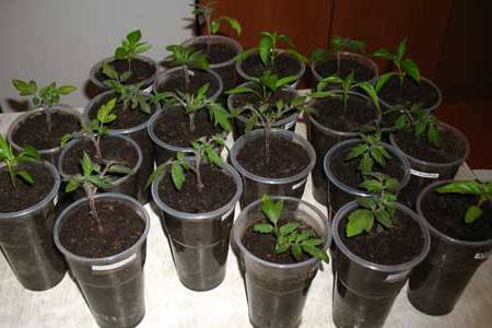 La collita de tomàquet sol caure entre 10 i 15 dies després de la germinació. Molts cultivadors trasplanten immediatament les plàntules en tasses grans separades. Com es demostra a la pràctica, per a la primera selecció s’aconsella prendre contenidors petits de mig litre. Els gots s’omplen de terra, s’aboca amb una solució feble de permanganat de potassi, amb una temperatura d’uns 23SobreC. Totes les plàntules, que tenen 3 fulles de ple dret, palen suaument amb una espàtula i es col·loquen en un got separat. Els brots lleugerament allargats estan enterrats fins al nivell de les fulles de cotiledó.