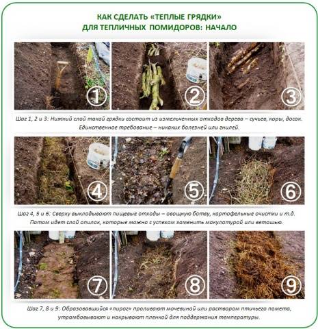 - Una manera més econòmica és escalfar el sòl amb matèria orgànica. A la pràctica, es veu així: el sòl s’elimina del llit del jardí i les substàncies orgàniques, com ara compost, palla, fem de vaca, humus, es col·loquen al fons de la rasa formada. La condició principal és que la matèria orgànica es trobi en estat de decadència. Aleshores, el procés de fermentació contribuirà a l’alliberament de calor, que es requereix per escalfar la terra del jardí. Des de dalt, la matèria orgànica en descomposició s’ha de cobrir amb una gruixuda capa de terra, en cas contrari els tomàquets simplement cremaran vius.