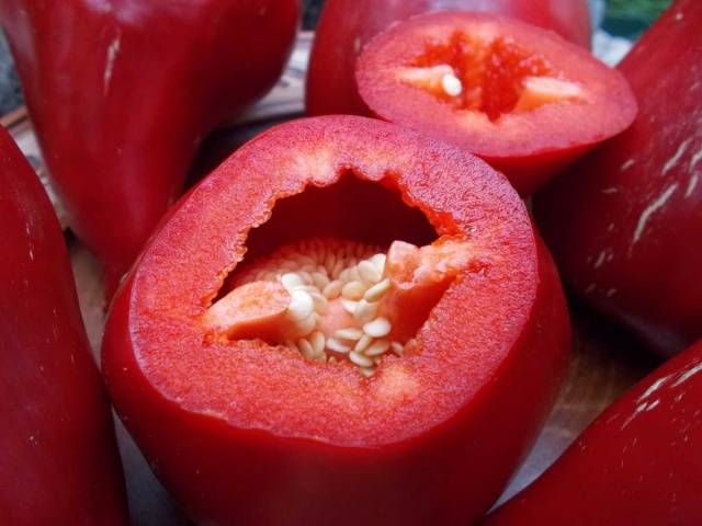 El tall mostra clarament que els pebrots tenen parets gruixudes i carnoses dins dels 8-10 mm. El pes d’una fruita és d’uns 160 grams i cada un té fins a 30 fruits. Tant per la rendibilitat! Aquesta característica queda perfectament confirmada per la foto de la varietat Lesya.