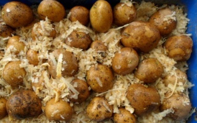 - Mètode sec: cistelles o caixes de fusta amb tubercles, distribuïdes en 1-2 fileres, es trauen al sol. La patata pren un to verdós, els ulls comencen a créixer. És important controlar la distribució suficient de la llum, girar periòdicament els tubercles perquè els brots es desenvolupin uniformement i siguin forts.