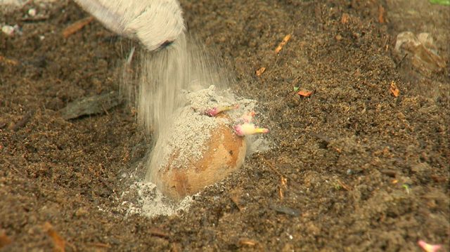 - Posar closques d’ou, closques de ceba, cendra de fusta, mostassa en pols al forat en plantar patates.
