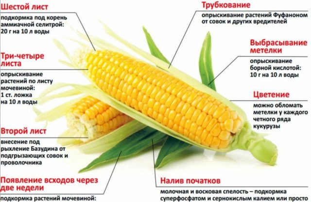 El blat de moro extreu de 24 a 30 kg de nitrogen, de 10 a 12 kg de fòsfor, de 25 a 30 kg de potassi durant la formació d’1 tona de gra, per tant, cal reposar els elements o afegir-los en cas d’escassetat. Velocitat d'aplicació superior: N - 60 kg, P - 60 - 90 kg, K - 40 - 60 kg. Els fertilitzants per al blat de moro per al gra s’apliquen amb cura, perquè la manca de nitrogen redueix el rendiment i el seu excés retarda la maduració.