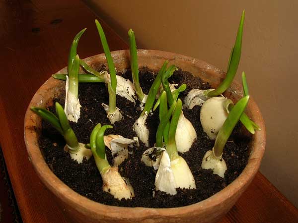 - Es planten en un recipient poc profund amb sòl fèrtil (capa de 2-3 cm) de manera que els claus s’ajusten perfectament.