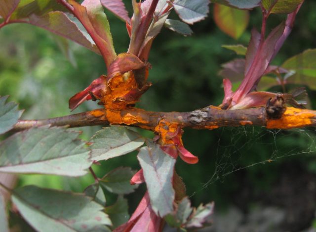 Durant el període de floració, l’òxid es pot estendre als brots. El fong interfereix amb el curs normal de la fotosíntesi a les cèl·lules de rosa. Al mateix temps, la infecció absorbeix els nutrients que ha acumulat la planta. Com a resultat, l’arbust comença a decolorar-se per la manca de clorofil·la. Si no es tracta, la planta es fa molt feble i posteriorment s’asseca o es congela a l’hivern.