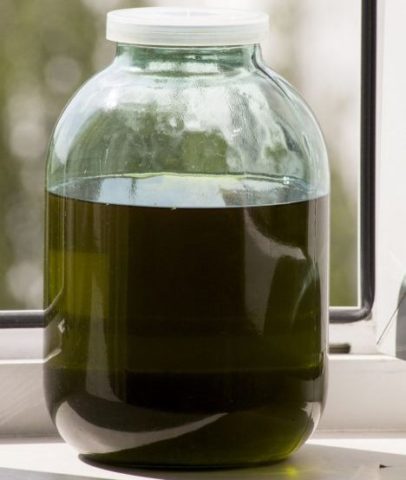 El líquid estarà llest per utilitzar-lo després que deixi de bombollar. La infusió es dilueix en aigua 1 a 2 i es ruixa sobre l’arbust.