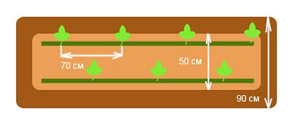 El diagrama que apareix a sota d’aquest paràgraf reflecteix clarament l’amplada del llit de sembra de síndria (90 cm), la distància entre els arbusts de plàntules (70 cm) i l’espai intermedi de la fila (50 cm). Aquest esquema es considera el més òptim per al cultiu de síndries en un hivernacle. El procediment per plantar plàntules de síndria és el següent: