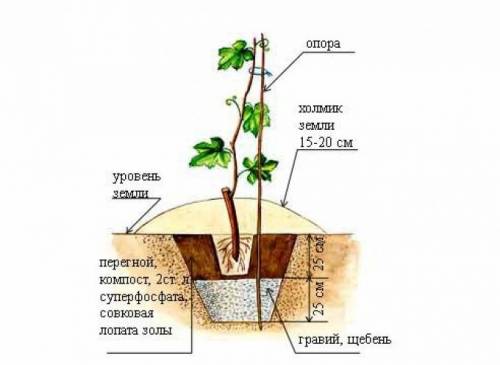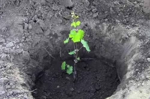 En cavar un forat, es deixa de banda la fèrtil capa superior de la terra. En el futur, el sòl s’utilitzarà per omplir de nou la plàntula de la varietat de raïm de taula, barrejant-la amb fertilitzants. El terreny dolent simplement s’anivella al lloc.