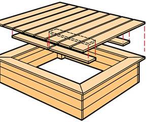 Una caixa de sorra de fusta muntada en forma de caixa quadrada no es considera una estructura completa. És hora de recordar la tapa. És massa aviat per solucionar-ho, però el perfeccionament de la caixa de fusta depèn del disseny escollit. Si l'elecció va caure sobre una coberta plegable, només cal esmolar els extrems dels costats i no es fa res més amb ells. Després d’instal·lar la tapa als laterals de la caixa, la majoria dels extrems desapareixeran sota el banc.