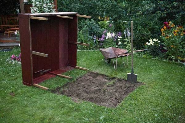 - Es col·loca una caixa de fusta enderrocada amb potes sobre una plataforma preparada. A més, el material de la brossa del fons de la fossa s’ha d’eliminar durant un temps. Els llocs per a les ranures es marquen al terra al voltant de les potes.