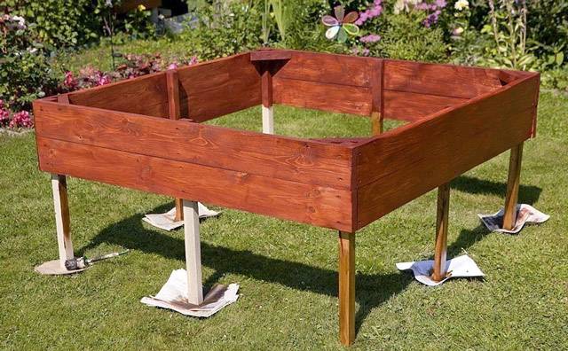 Les potes d'una barra amb una secció de 50x50 mm es claven a la caixa de fusta acabada a les cantonades i al centre dels laterals. Els suports sobresurten per la caixa i són necessaris per fixar la caixa de sorra al terra.