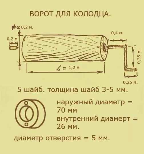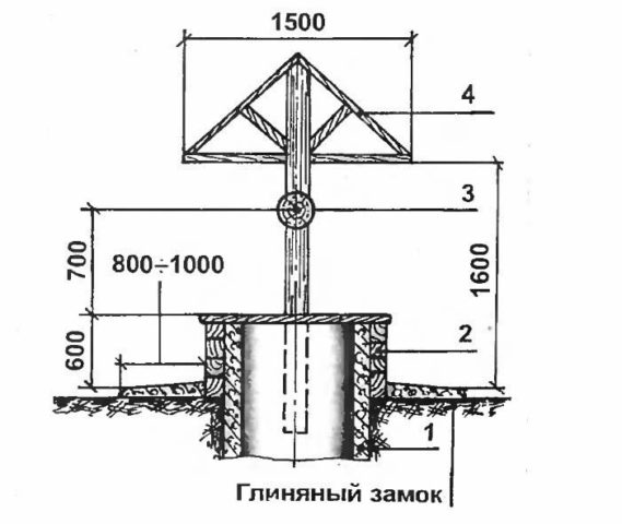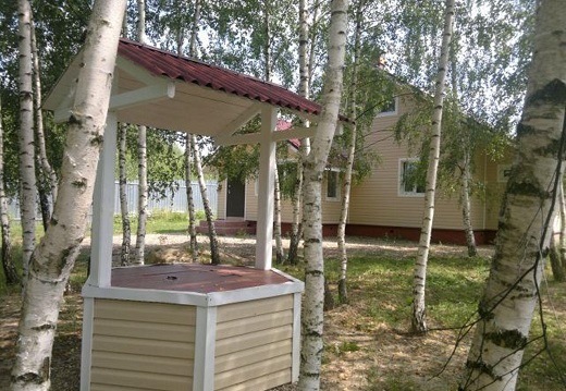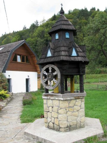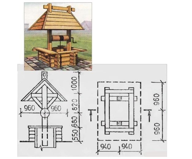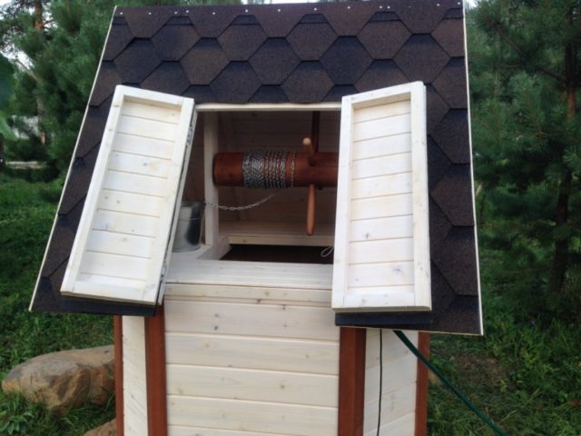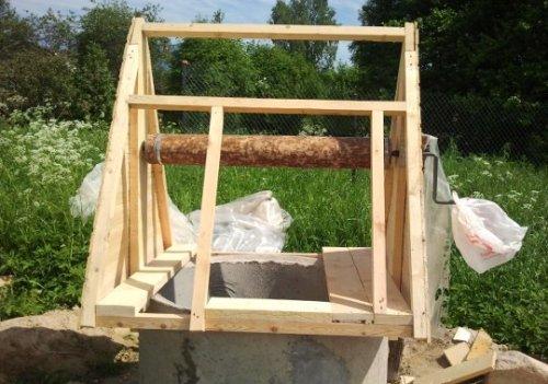Per la mida del cap, es tronquen troncs de la mateixa longitud i es col·loquen en un marc al voltant de la mina. Les vores que surten poden tenir retalls arrissats com a decoració de l’estructura. Els pals verticals s’adhereixen a l’estructura massiva, que inclouen suports per a la resistència. Als suports s’uneix una porta amb cadena i galleda, s’aixeca un marc del sostre. A causa de la solidesa de l’estructura, la coberta es pot revestir amb qualsevol material: pissarra, material per a sostres, teules.