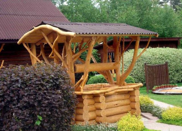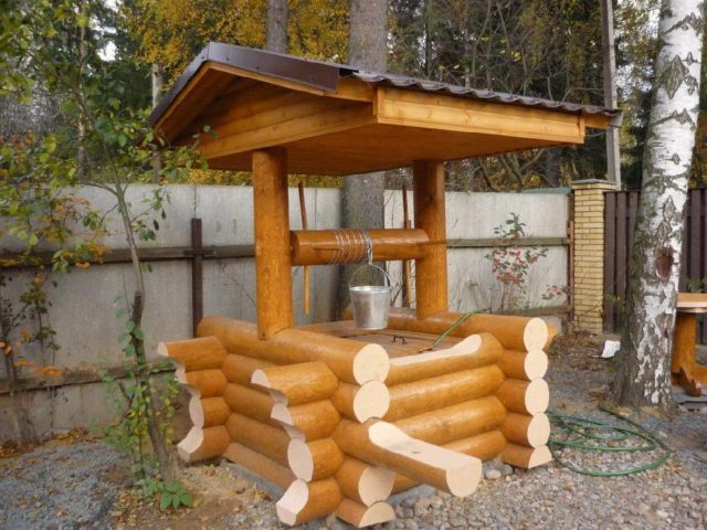 Quan es construeix una estructura, les bigues d’una sola peça són populars. Una casa per a un pou d’un tronc arrodonit amb les seves pròpies mans resulta ser sòlida i massiva. Normalment, aquestes estructures es col·loquen en forma quadrangular, les cantonades estan alineades amb o sense resta.