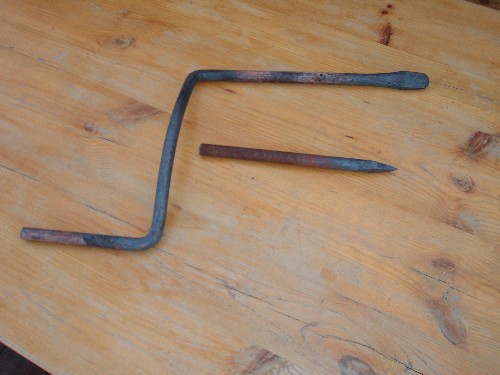 Talleu els anells de 5 cm de llarg d'una canonada metàl·lica amb una secció transversal de 35 mm i introduïu-los als extrems del registre per protegir-vos contra la divisió. Es foraden forats als anells de fins a 10 cm cadascun. Es fabriquen dos espais en blanc a partir d’una vareta metàl·lica amb una secció transversal de 35 mm: una curta de 20 cm i una altra de llarga per a un mànec de 100 cm. en funcionament, un dels seus extrems està aplanat.