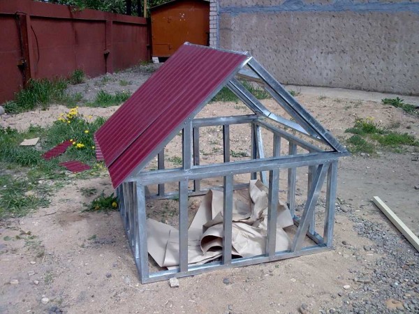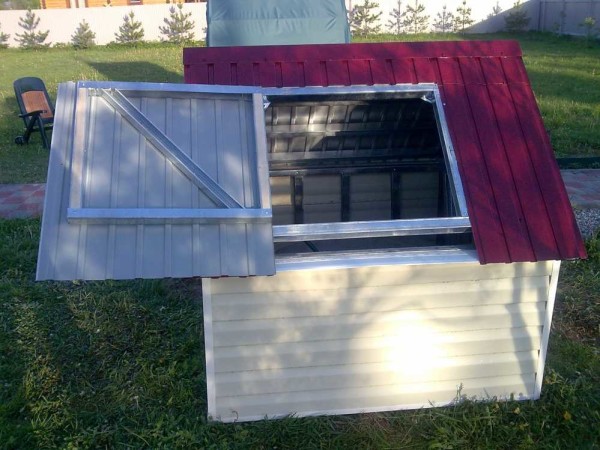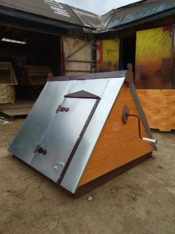 Es col·loca un sostre al marc acabat: un full perfilat o, després de fixar la base amb fusta contraxapada, teules toves. Els laterals estan revestits amb el material disponible: revestiment o taulell.