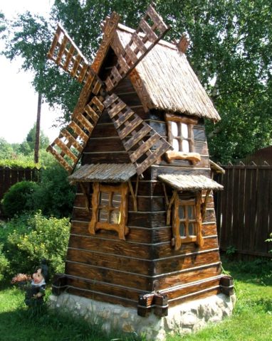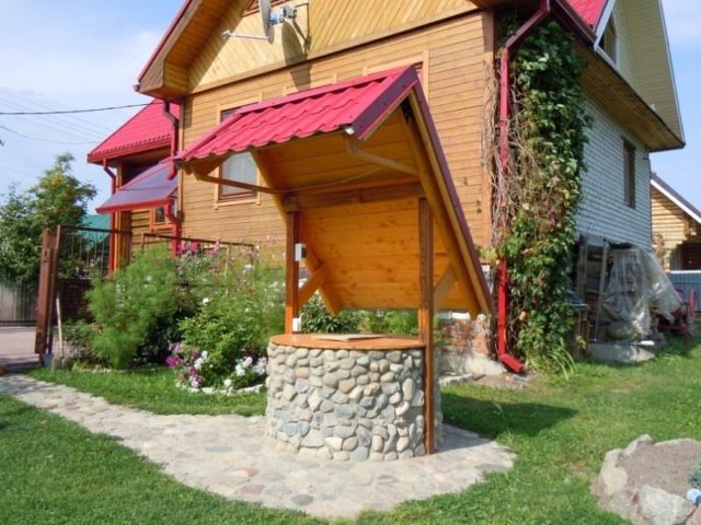 - La combinació d’una estructura de pou amb els edificis principals del lloc. Els dissenyadors de paisatges recomanen que, a l’hora d’escollir una carcassa per a una casa, se centri en altres elements del jardí i es mantingui tot el disseny en un sol estil.