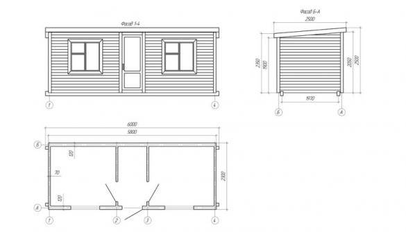 L’últim dels projectes presentats és el més difícil, però convenient. La disposició es fa de manera que els tres compartiments siguin adjacents entre si. La major part del bloc d’utilitat es destina a un graner. Cada habitació té la seva pròpia porta situada als diferents costats de l'edifici.