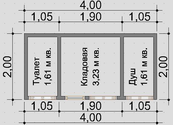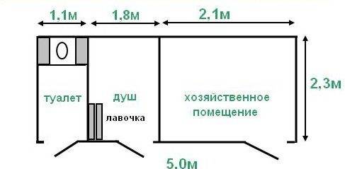 El diagrama mostra un bloc d’utilitat amb unes dimensions de 2x4 m. La distribució és molt reeixida, ja que el vàter i la dutxa estan separats per una tercera habitació reservada al traster. Gràcies a això, les olors desagradables del vàter no penetraran a la dutxa, però cal fer una bona ventilació al rebost. Cada compartiment té la seva pròpia porta i el rebost també està equipat amb una finestra.