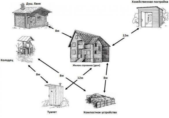 A l’hora d’escollir un lloc per a un bloc de serveis públics, s’ha de tenir en compte que serà necessari un pou de desguàs per a lavabo i dutxa. L’elecció de la seva ubicació es deu a les normes sanitàries. Tenen en compte la distància a les fonts d’aigua, edificis residencials, espais verds, tanca d’un veí, etc. A la foto es mostren paràmetres importants que s’han d’observar a l’hora d’escollir un lloc per instal·lar una unitat de serveis públics.
