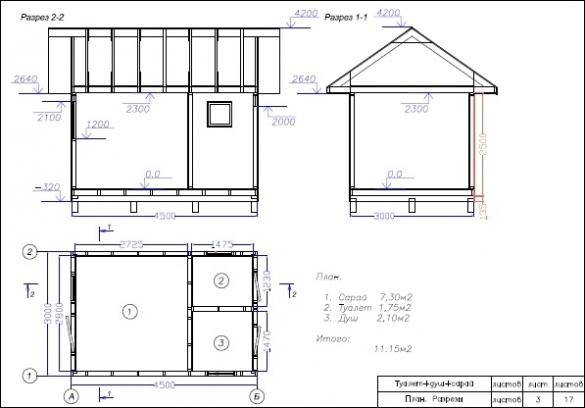 El segon projecte presenta de manera similar un bloc d’utilitat amb tres compartiments. La diferència de disseny és la presència d’algunes portes d’entrada. Hi ha finestres a la paret frontal de les altres dues habitacions. Els locals estan interconnectats per portes internes. Quina de les habitacions donar per a la dutxa, cobert i lavabo correspon al propietari decidir. Tot i que és raonable fer del compartiment mitjà un graner, és incòmode entrar al bloc de serveis públics per una dutxa o lavabo.