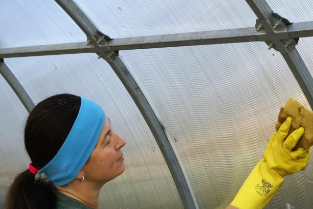 - Renteu la coberta de l’hivernacle amb aigua sabonosa, prestant especial atenció a les articulacions i les costures on es poden trobar larves d’insectes i microorganismes.