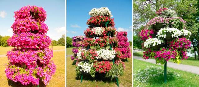 Ara queda encadenar la resta de contenidors a la vareta, recollint alguna cosa com una piràmide infantil. El sòl s’aboca a tots els tests i es planten petúnies. Aquests parterres de flors verticals per a petúnies es veuen més bells si se seleccionen varietats de plantes amb tiges llargues: les flors penjants cobriran la part antiestètica de l'estructura.