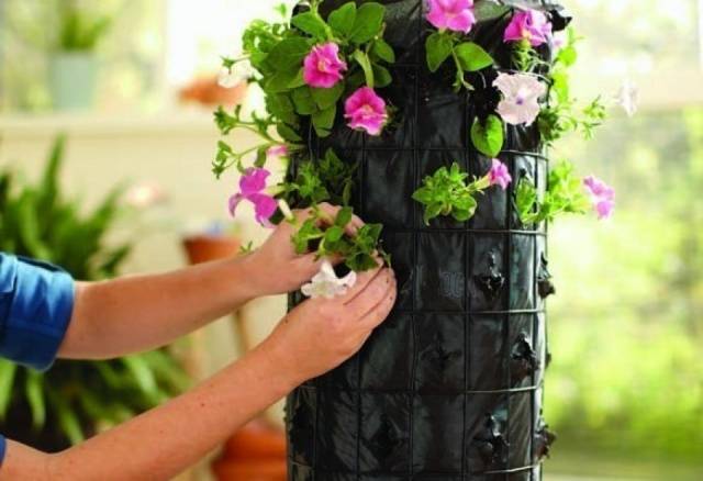 Un cilindre es torça des d’una malla amb petites cel·les. Podeu fixar la forma amb pinces de plàstic o filferro. El cilindre es col·loca dins d’un test gran o test. El geotèxtil o un altre teixit negre es revesteix des de l'interior del cilindre. Ara el formulari està cobert de terra, l’espai lliure del test també s’omple de terra. Els forats es tallen a través de la malla dels teixits; és millor disposar-los en un patró de quadres. Feu servir el dit per aprofundir el sòl a través del forat i plantar-hi les plàntules de petúnies.Al cap d’un temps, les plantes cobriran tot l’espai lliure i el cilindre semblarà un pilar florit.