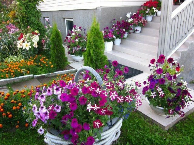 Els arbustos de tifons són una decoració sorprenent de qualsevol paisatge. Petunia té una bellesa increïble en olles portàtils, que es poden col·locar, per exemple, als dos costats de la porta principal. Alguns s’instal·len als graons de les escales, si l’amplada ho permet. Aquestes testes són fàcils de transportar i poden, si cal, decorar zones de paisatge individuals. Per exemple, els testos de petúnies es transfereixen al carreró central de la dacha quan es planifiquen festes de casament.