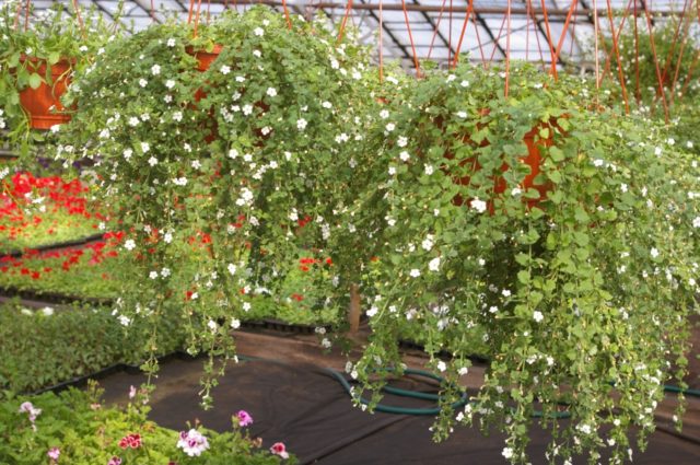 Els productors experimentats recomanen plantar bacopa ampelosa en testos penjants o testos per a diversos arbustos (2-3 plantes en un recipient, fins a 5 litres). A més d’estructures penjants, podeu plantar flors més exteriors: