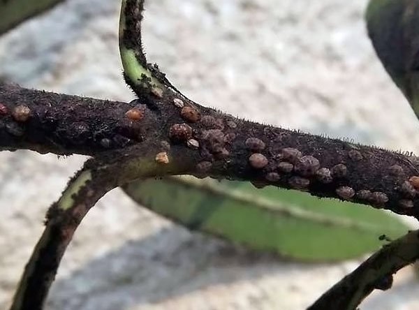 - Fongs fulgurants o "canalla" (Capnopodium) es manifesta com una floració negra en forma de petites espores del fong, que obstrueix els porus i altera el metabolisme de les cèl·lules vegetals. Com a tractament de la malaltia ampelosa de la bacopa, s’utilitzen fungicides moderns o una solució de sabó per a roba i sulfat de coure.